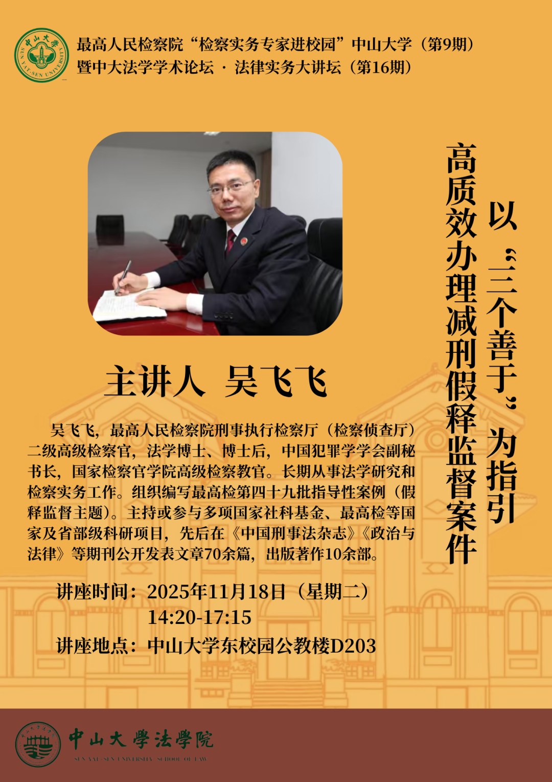 最高人民检察院“检察实务专家进校园”中山大学(第9期)、中大法学学术论坛·法律实务大讲坛(第16期):以“三个善于”为指引高质效办理减刑假释监督案件